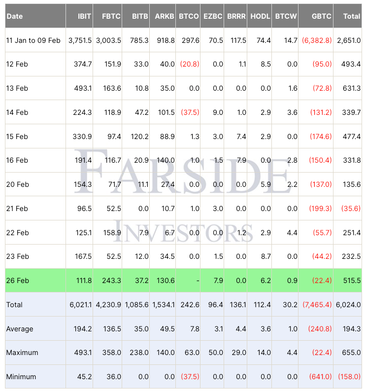 Bitcoin ETFs notched $515 million in daily inflows on Feb. 26. Source: Farside Investors