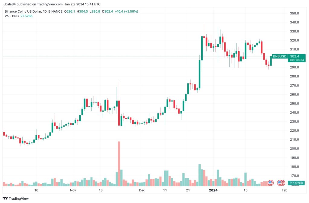 The native token of BNB Chain, BNB, initiated a rebound on January 26, gaining 3% and reclaiming the $300 mark. Despite its previous weakness, the ongoing recovery is underpinned by a surge in network activity.