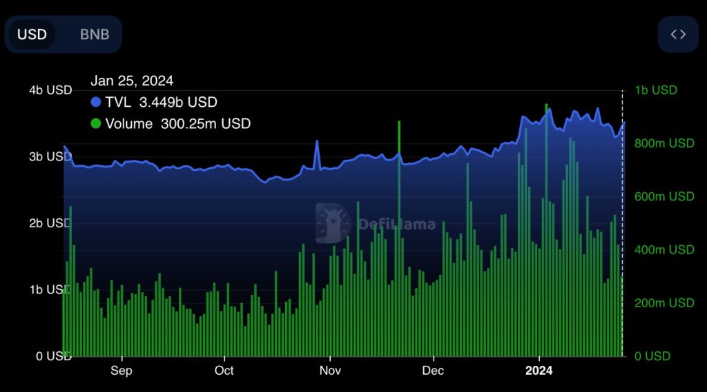Data from DefiLlama reveals a steady increase in BNB Chain’s TVL from mid-December 2023, peaking at $3.73 billion on January 18. Despite a slight dip in this metric in recent days, a resurgence on January 25 indicates growing user trust in the blockchain.