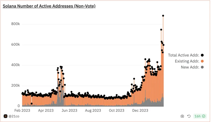 In a remarkable display of growth, the Solana (SOL) blockchain has shattered its previous records, achieving an all-time high in active addresses in January. On January 31, the Solana network recorded an impressive milestone with over 884,000 active addresses.